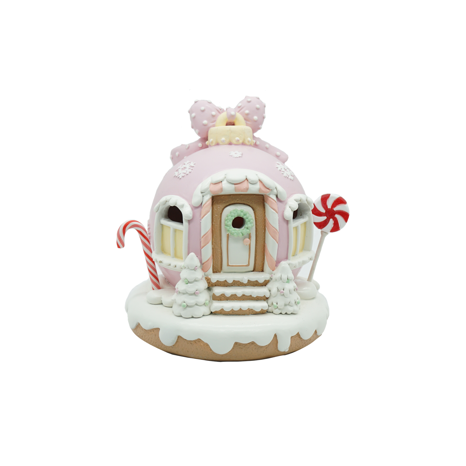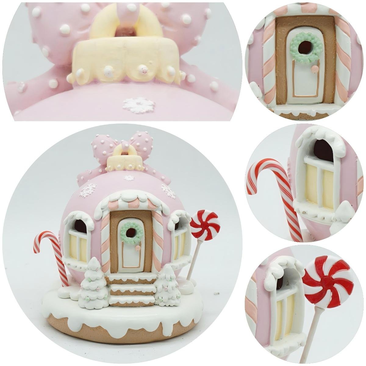 The pink candy house is a lovely addition to your Christmas home decorations. Candy detailing pairs perfectly with other holiday decorations;